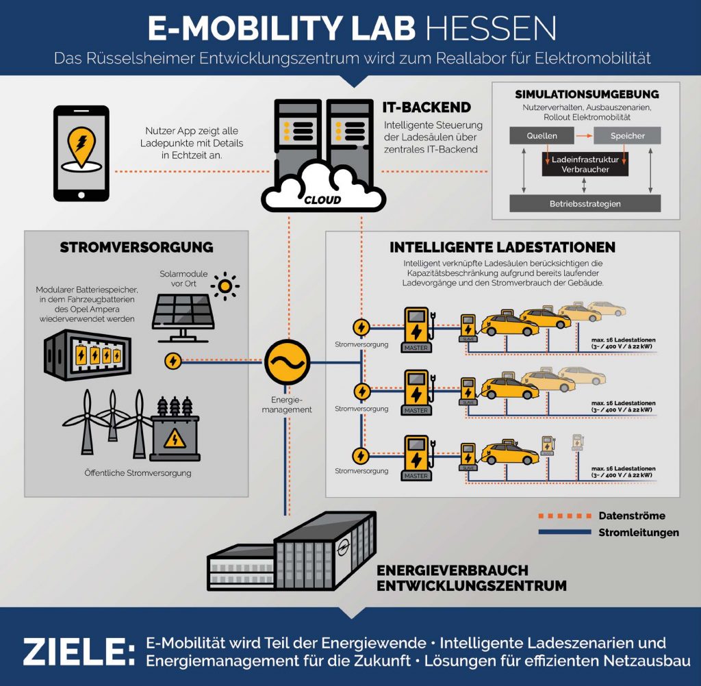 Das Laden von E-Flotten wird für Unternehmen immer bedeutsamer. Im Verbundprojekt E-Mobility-LAB Hessen mit den Industriepartnern Opel, FLAVIA IT und Plug’n Charge sowie dem House of Energy wurde auf dem Opel-Gelände eine intelligente Ladeinfrastruktur mit mehr als 120 Ladepunkten aufgebaut. Das Reallabor auf dem Opel-Campus bildet die Mobilitätssituation im Jahr 2035 in Hessen ab. Die smarte Infrastruktur soll es ermöglichen, die gesamte Flotte trotz hohem Energiebedarf jederzeit bedarfsgerecht zu laden. Gefördert durch die Mittel des europäischen EFRE-Programms, ist dieses Projekt ein gutes Bespiel einer gelungenen Zusammenarbeit zwischen Industrie und Forschung in Hessen. Die Daten des Aufbaus dienen den Forschungspartnern, den Lade­infrastrukturbedarf der nächsten Jahre hinsichtlich bedarfsgerechten und netzentlastenden Ladeverhalten abzuschätzen.